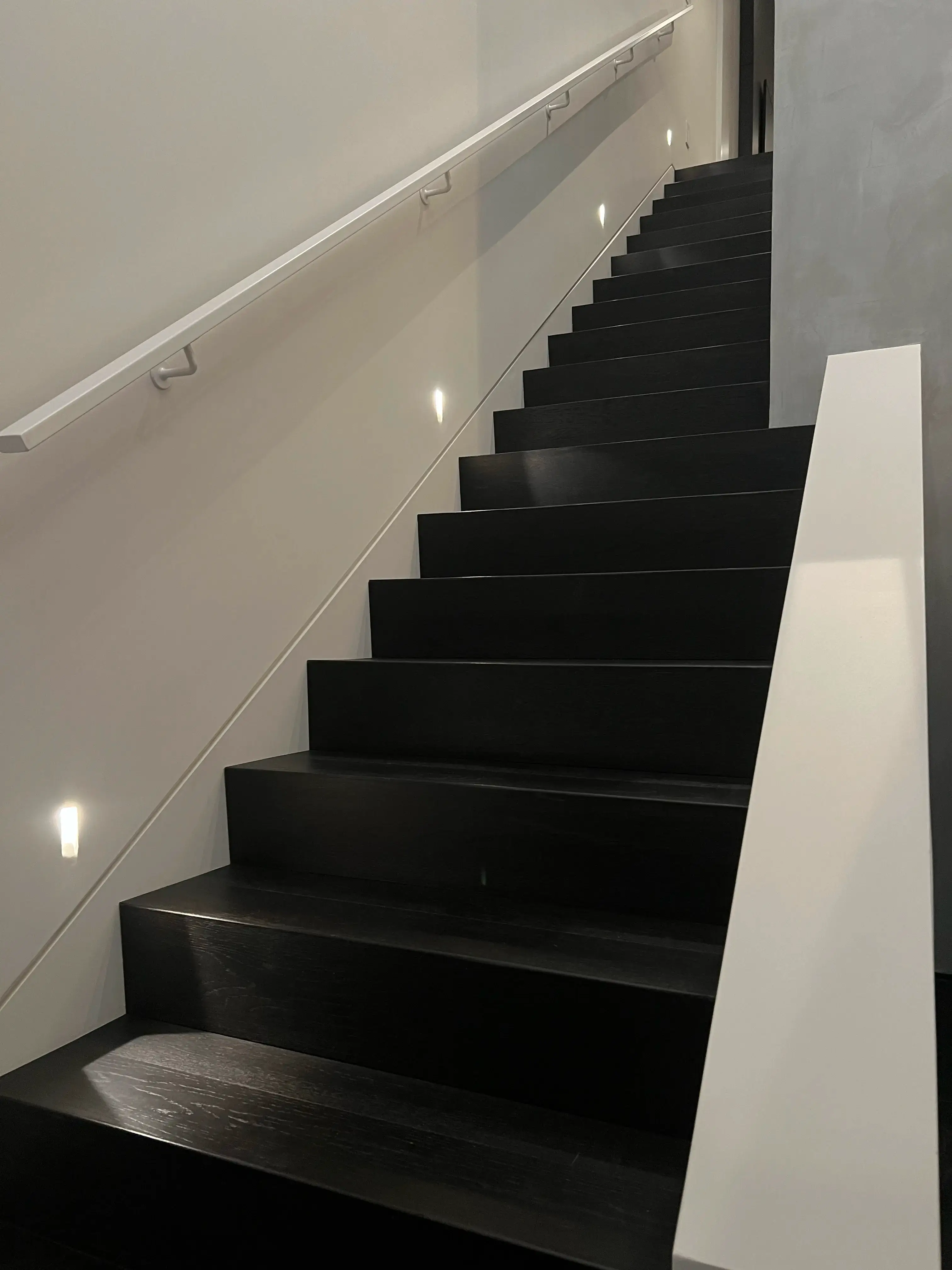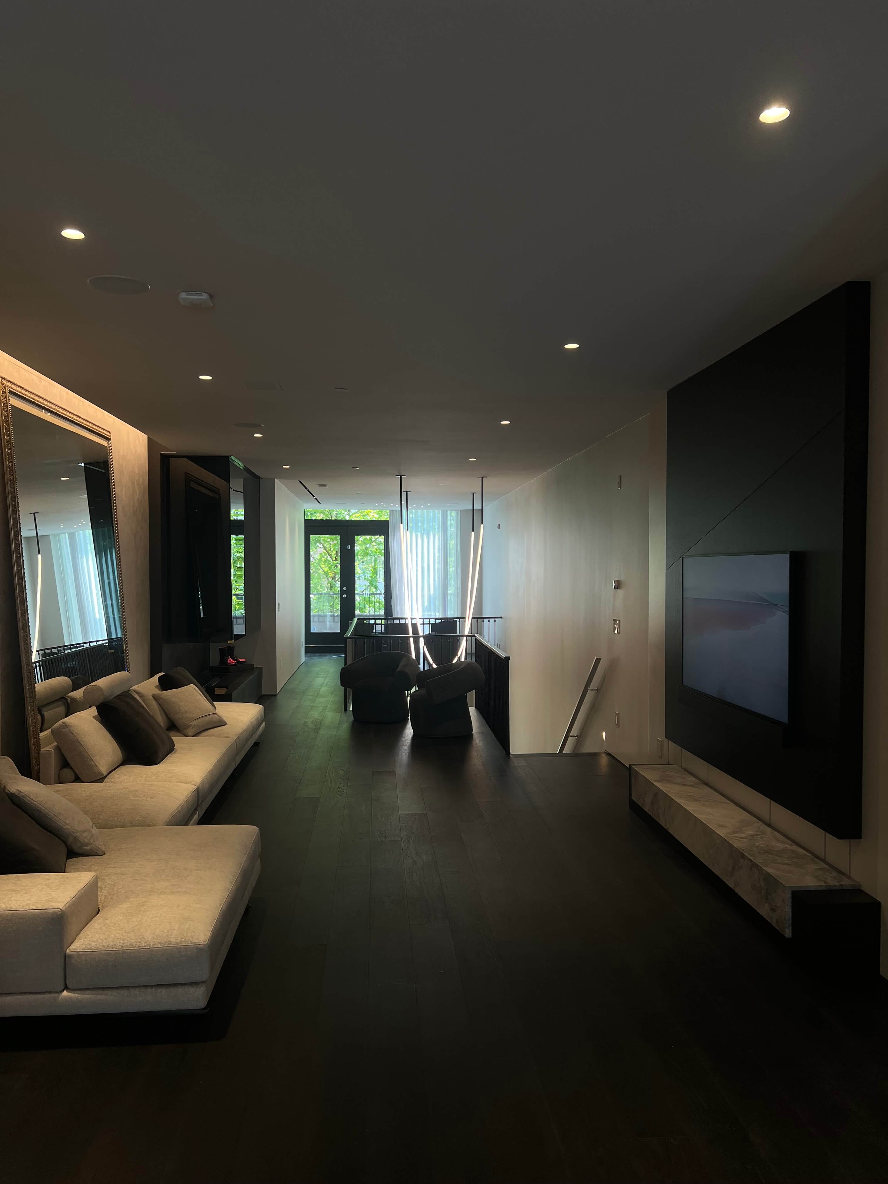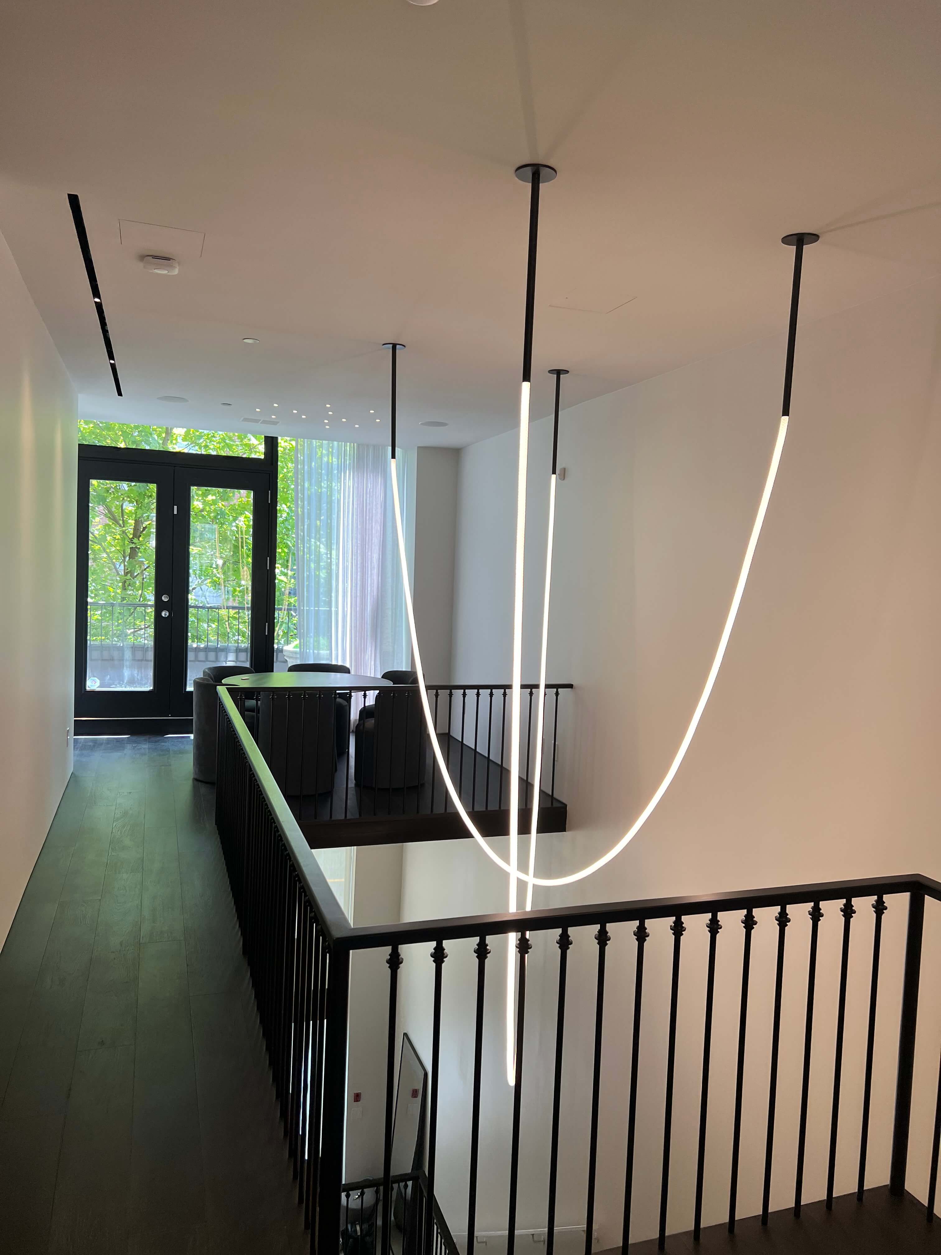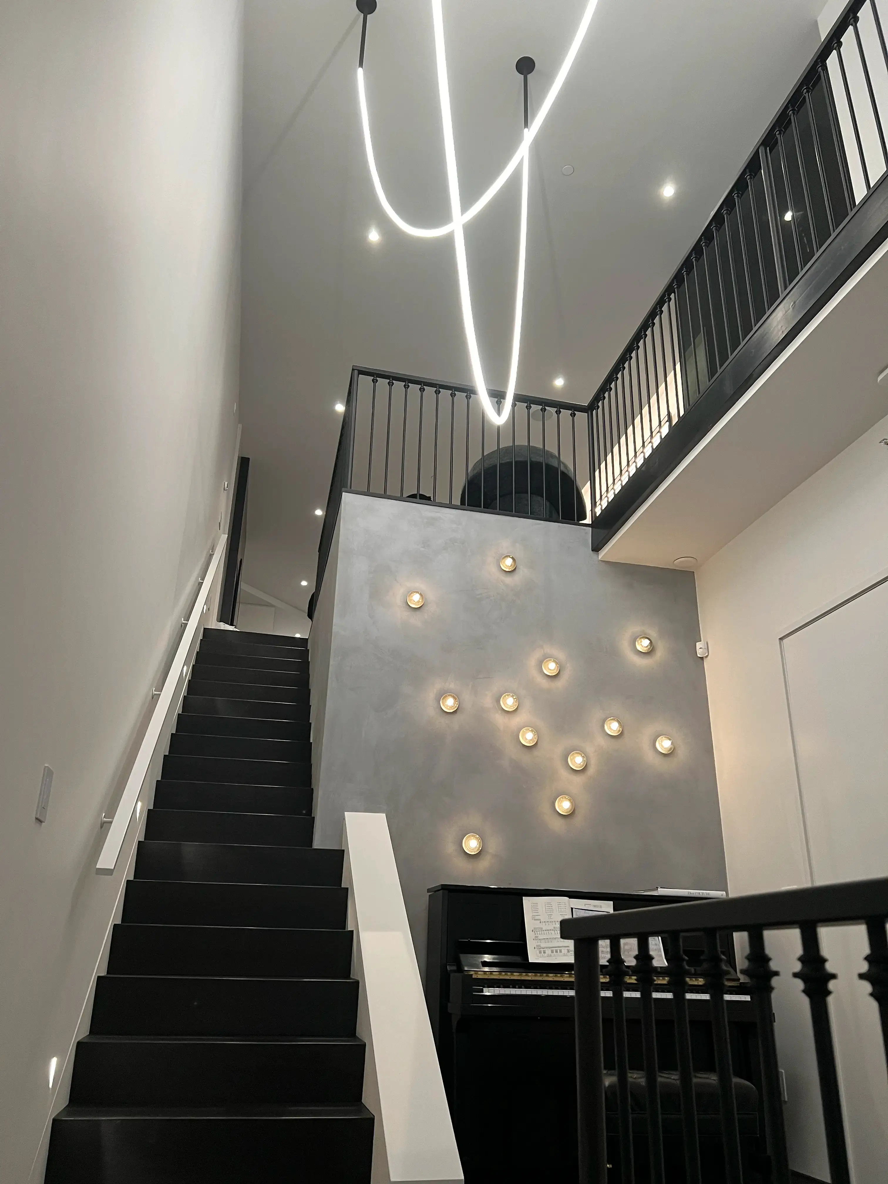 The project featured custom lighting installations throughout—including integrated wall sconces, LED accents, and minimalist feature fixtures—to enhance the home’s dramatic design elements. From the sculptural light forms in the entryway to the subtle backlighting in the bathrooms and staircases, every detail was thoughtfully placed for both form and function.