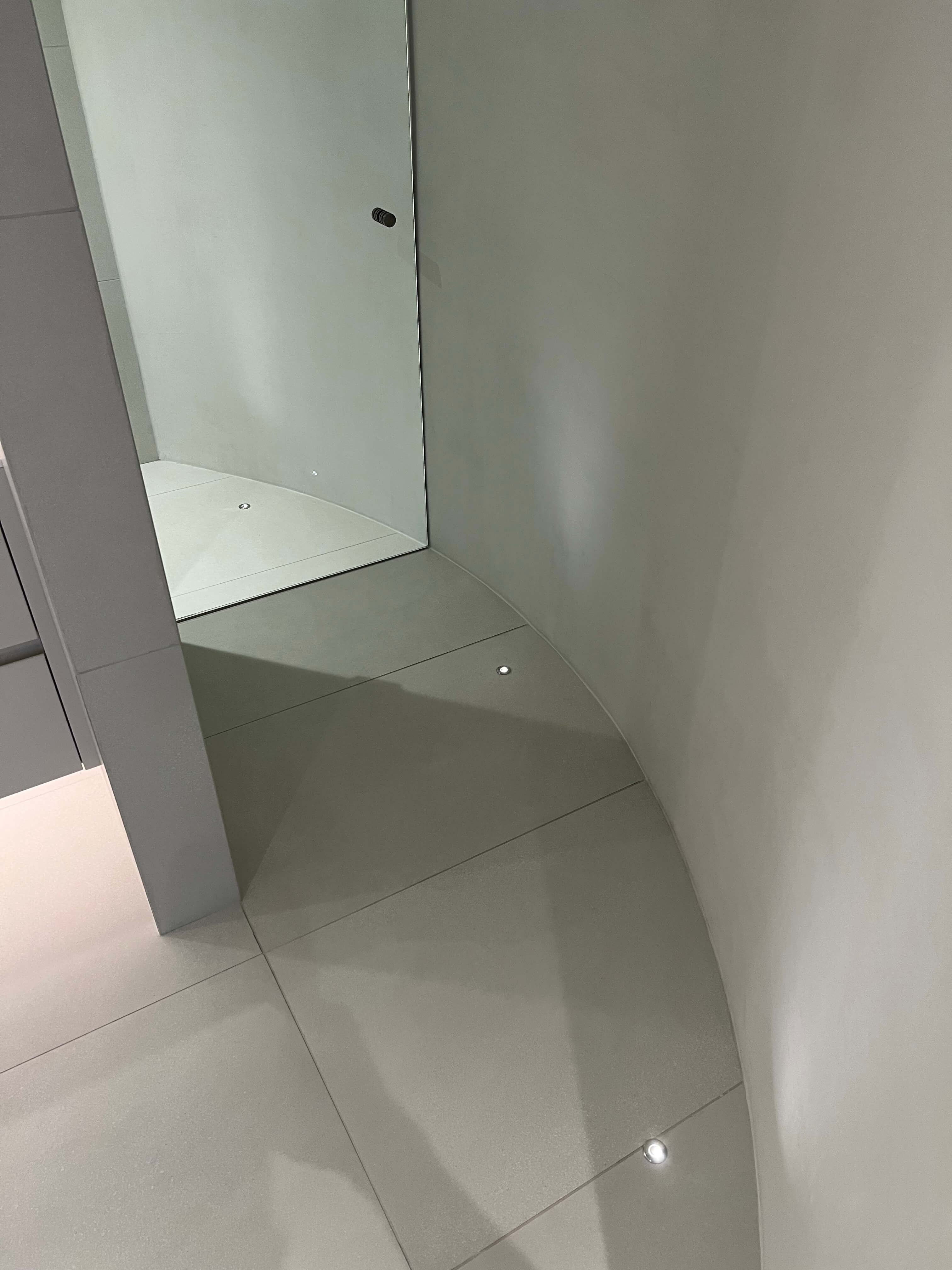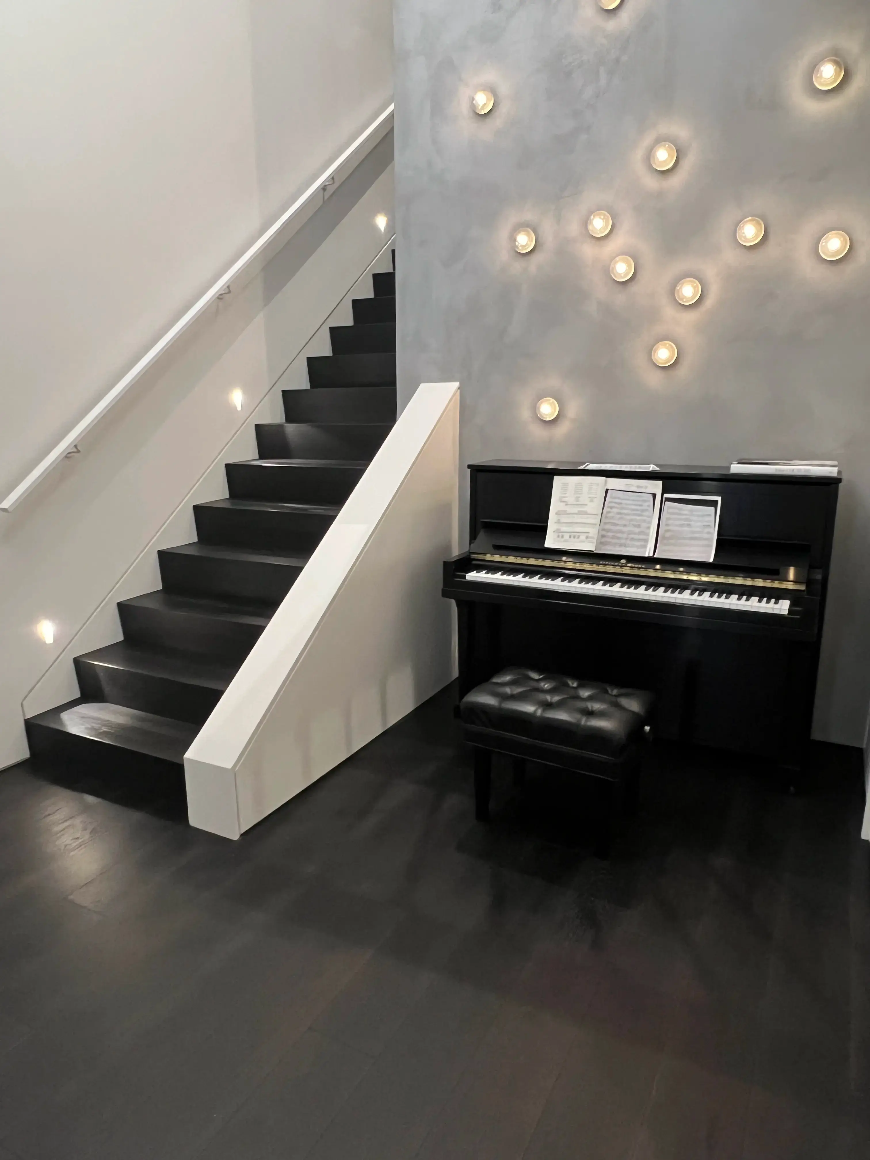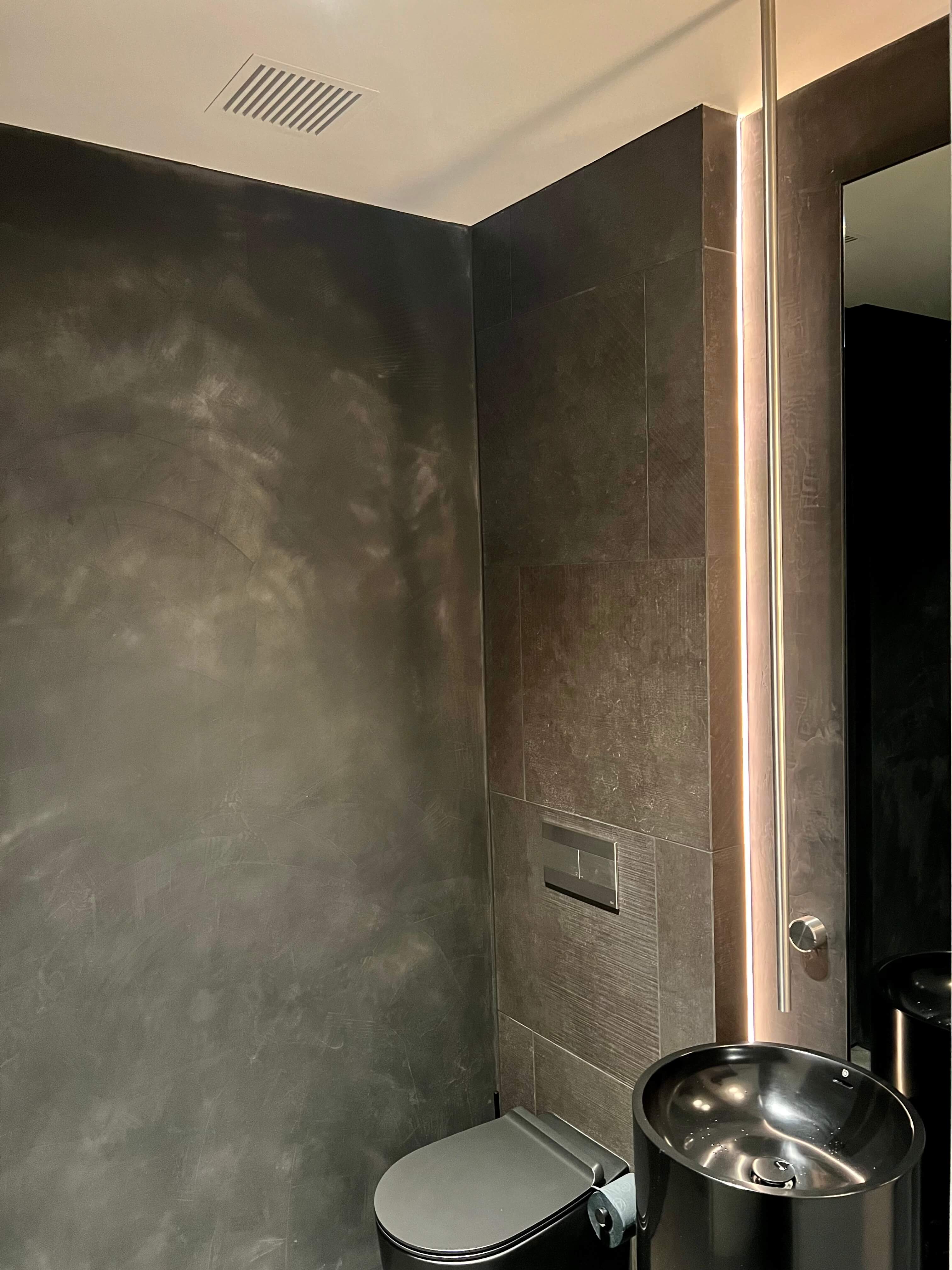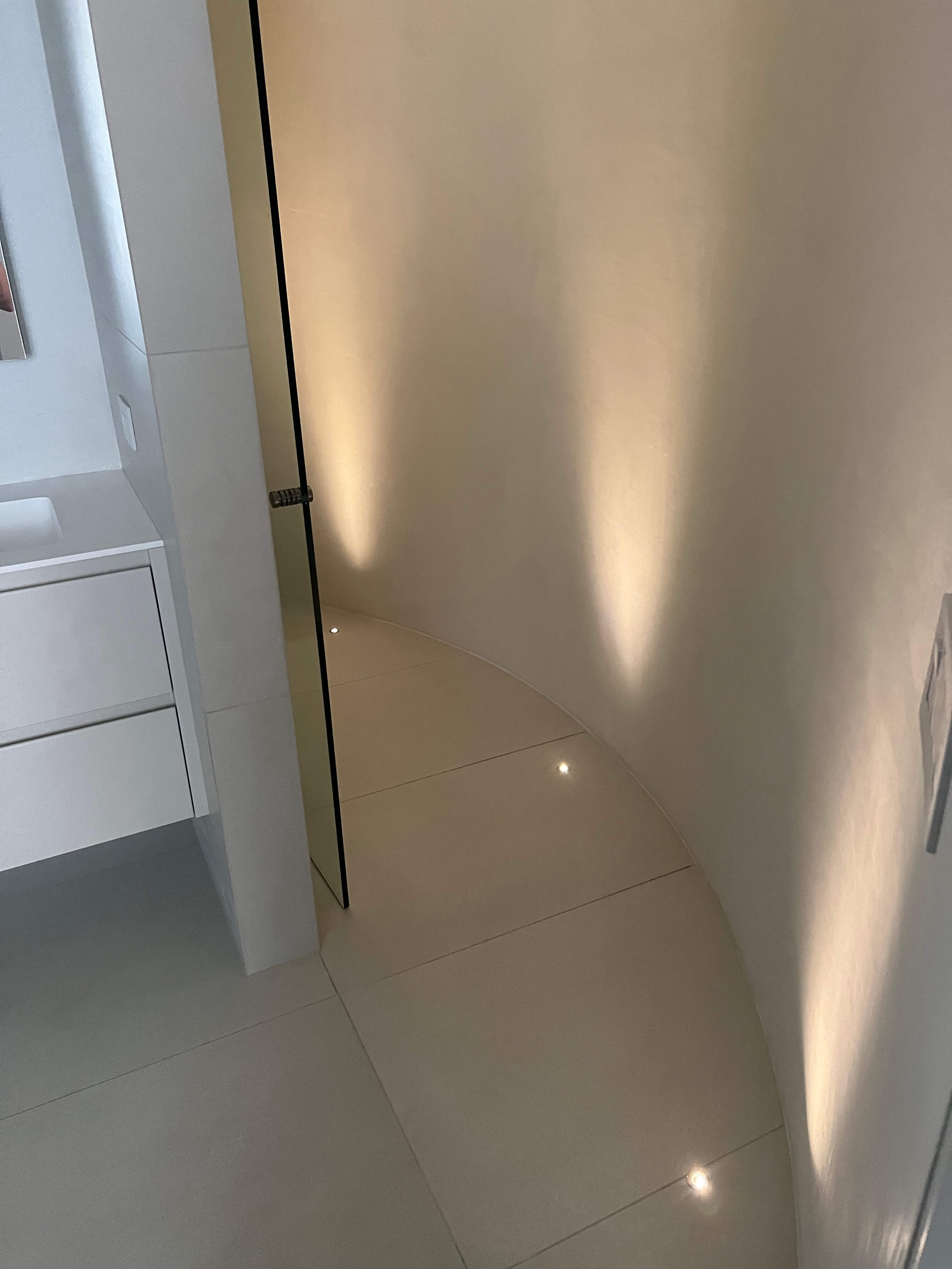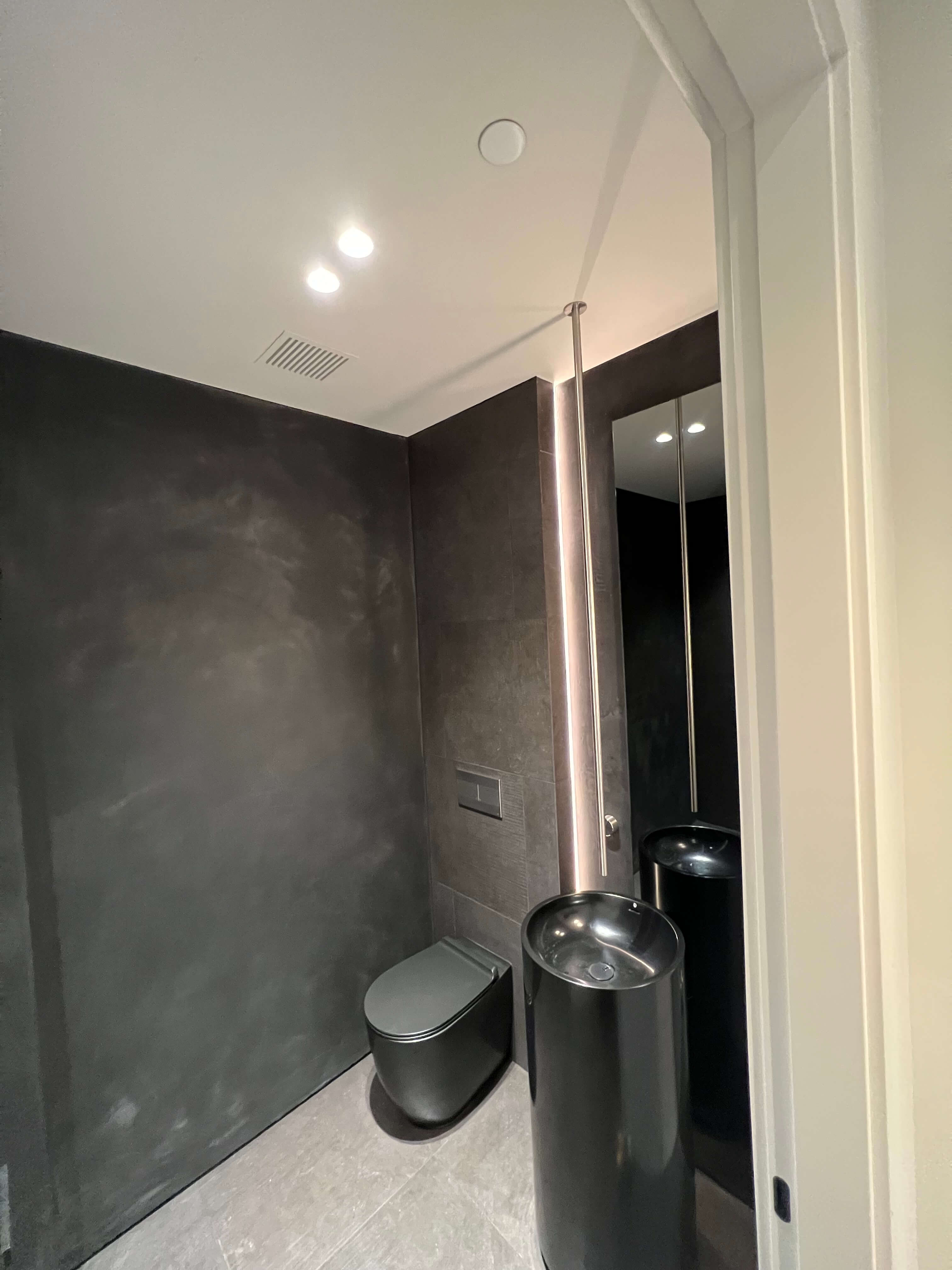 The project featured custom lighting installations throughout—including integrated wall sconces, LED accents, and minimalist feature fixtures—to enhance the home’s dramatic design elements. From the sculptural light forms in the entryway to the subtle backlighting in the bathrooms and staircases, every detail was thoughtfully placed for both form and function.